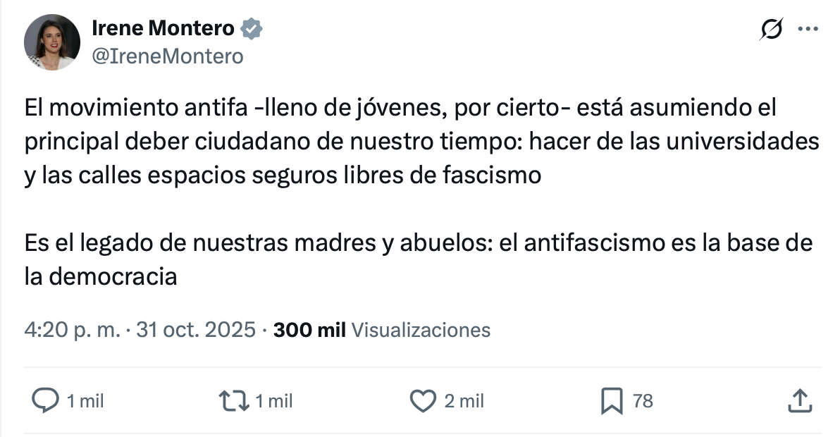 Estos tweets emitidos entre los días 29 y 31 de octubre de 2025 reflejan de manera bastante precisa la situación en la que nos encontramos como consecuencia de la táctica de división y enfrentamiento que desarrolla la autodenominada izquierda desde hace bastantes años.