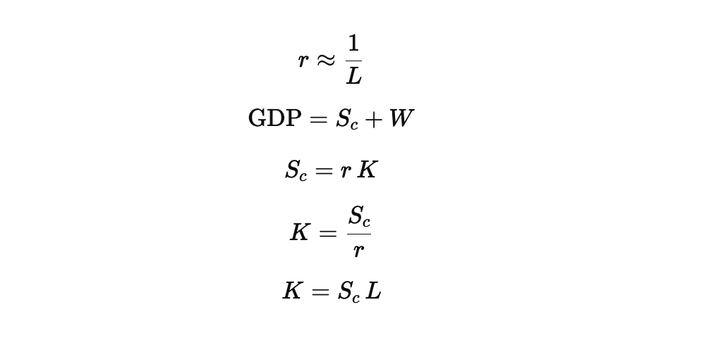 Accordingly, the calculation of K follows from considering the share of capital in GDP (GDP minus labor costs, which we denote Sc), divided by r (that is, by 1/L); in other words, Sc*L. The capital required to generate the observed return is thus the capital share of income multiplied by the length of working life.