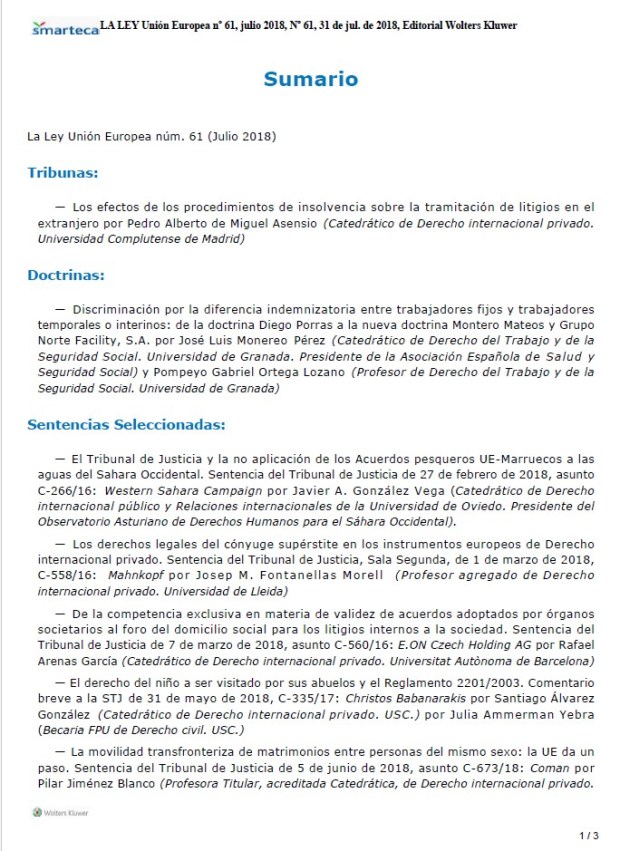 «De la competencia exclusiva en materia de validez de acuerdos adoptados por órganos societarios al foro del domicilio social para los litigios internos a la sociedad. Sentencia del Tribunal de Justicia de 7 de marzo de 2018, asunto C-560/16: EON Czech Holding AG«. Publicado en La Ley Unión Europea, 2018, julio, núm. 61, 16 pp.