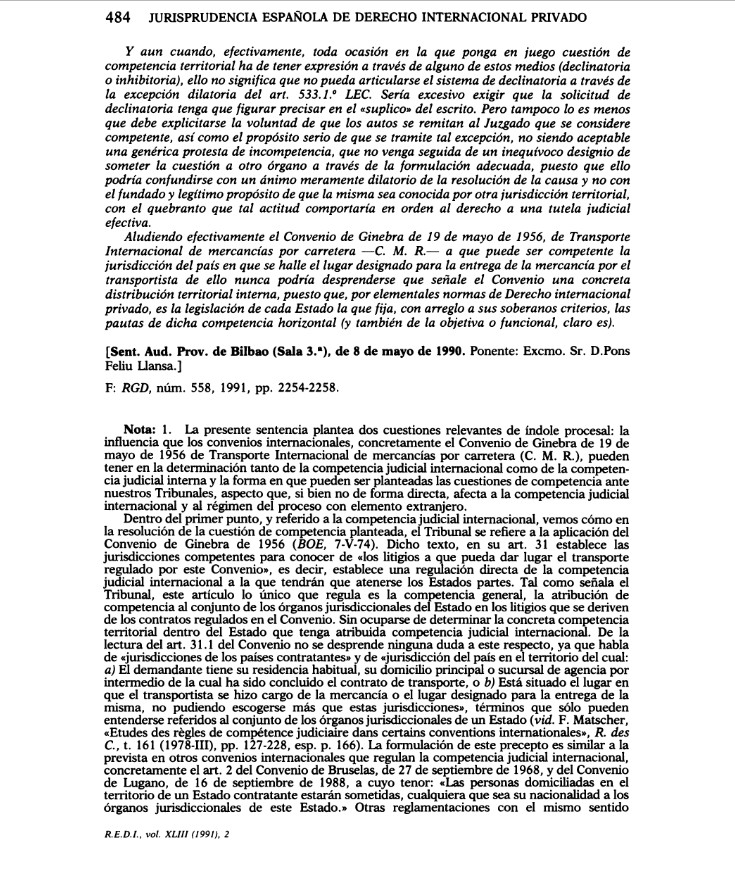 Nota: 1. La presente sentencia plantea dos cuestiones relevantes de índole procesal: la influencia que los convenios internacionales, concretamente el Convenio de Ginebra de 19 de mayo de 1956 de Transporte Internacional de mercancías por carretera (C.M.R.), pueden tener en la determinación tanto de la competencia judicial internacional como de la competencia judicial interna y la forma en que pueden ser planteadas las cuestiones de competencia ante nuestros Tribunales, aspecto que, si bien no de forma directa, afecta a la competencia judicial internacional y al régimen del proceso con elemento extranjero.