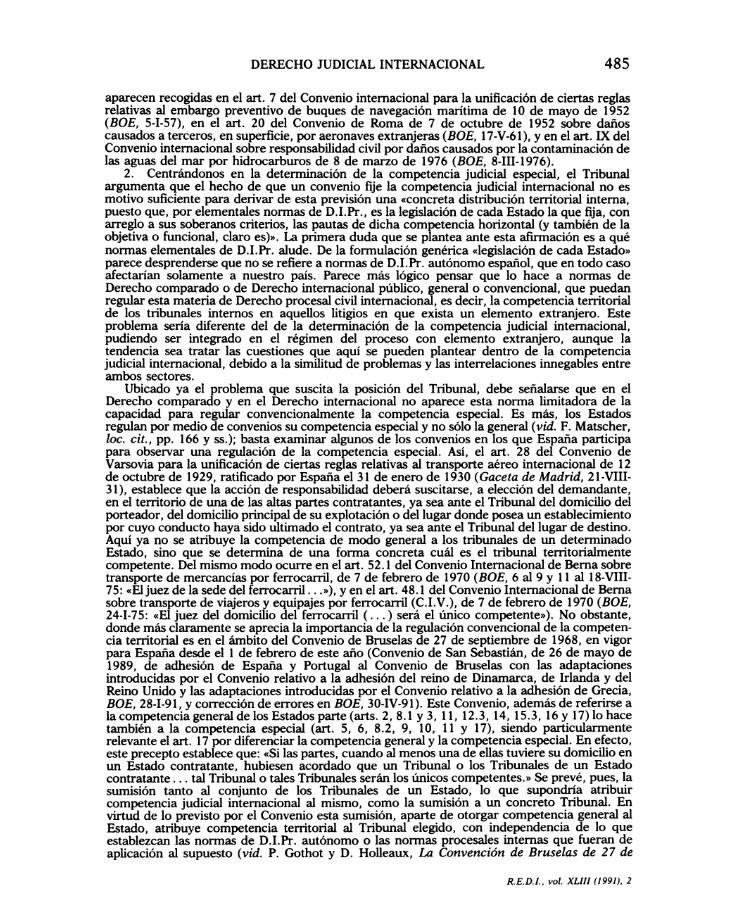 Ubicado ya el problema que suscita la posición del Tribunal, debe señalarse que en el Derecho Comparado y en el Derecho Internacional no aparece esta norma limitadora de la capacidad para regular convencionalmente la competencia especial. Es más, los Estados regulan por medio de convenios su competencia especial y no sólo la general. (vid. F. Matscher loc. cit. pp. 166 y ss.); basta examinar algunos de los convenios en los que España participa para observar una regulación de la competencia especial. Así, el art. 28 del Convenio de Varsovia para la unificación de ciertas reglas relativas al transporte aéreo internacional de 12 de octubre de 1929, ratificado por España el 31 de enero de 1930 (Gaceta de Madrid, 21-VIII-31), establece que la acción de responsabilidad deberá suscitarse, a elección del demandante, en el territorio de una de las Altas Partes Contratantes, ya sea ante el Tribunal del domicilio del porteador, del domicilio principal de su explotación o del lugar donde posea un establecimiento por cuyo conducto haya sido ultimado el contrato, ya sea ante el Tribunal del lugar de destino. Aquí ya no se atribuye la competencia de modo general a los tribunales de un determinado Estado, sino que se determina de una forma concreta cuál es el tribunal territorialmente competente. Del mismo modo ocurre en el art. 52.1 del Convenio Internacional de Berna sobre transporte de mercancías por ferrocarril, de 7 de febrero de 1970 (ratificación de España el 19 de noviembre de 1974, B.O.E., 6 al 9 y 11 al 18 -VIII-75,: «El Juez de la sede del ferrocarril…») y en el art. 48.1 del Convenio Internacional de Berna sobre transporte de viajeros y equipajes por ferrocarril (C.I.V.) de 7 de febrero de 1970, (ratificación de España de 13 de julio de 1974, B.O.E., 24-I-75,: «El Juez del domicilio del ferrocarril (…) será el único competente»). No obstante, donde más claramente se aprecia la importancia de la regulación convencional de la competencia territorial es en el ámbito del Convenio de Bruselas de 27 de setiembre de 1968, en vigor para España desde el 1 de febrero de este año (Convenio de San Sebastián de 26 de mayo de 1989 de adhesión de España y Portugal al Convenio de Bruselas con las adaptaciones introducidas por el Convenio relativo a la adhesión del Reino de Dinamarca, de Irlanda y del Reino Unido y las adapataciones introducidas por el Convenio relativo a la adhesión de Grecia, B.O.E., 28-I-91, y corrección de errores en B.O.E., 30-IV-91). Este Convenio además de referirse a la competencia general de los Estados parte (arts. 2, 8.1 y 3, 11, 12.3, 14, 15.3, 16 y 17) lo hace también a la competencia especial (art. 5, 6, 8.2, 9, 10, 11 y 17), siendo particularmente relevante el art. 17 por diferenciar la competencia general y la competencia especial. En efecto, este precepto establece que: «Si las partes, cuando al menos una de ellas tuviere su domicilio en un Estado contratante, hubiesen acordado que un Tribunal o los Tribunales de un Estado contratante… tal Tribunal o tales Tribunales serán los únicos competentes.» Se prevé, pues, la sumisión tanto al conjunto de los Tribunales de un Estado, lo que supondría atribuir competencia judicial internacional al mismo, como la sumisión a un concreto Tribunal. En virtud de lo previsto por el Convenio esta sumisión, aparte de otorgar competencia general al Estado, atribuye competencia territorial al Tribunal elegido, con independencia de lo que establezcan las normas de D.I.Pr. autónomo o las normas procesales internas que fueran de aplicación al supuesto. (vid. P. Gothot y D. Holleaux, La Convención de Bruselas de 27 de septiembre de 1968, Madrid, La Ley, 1985, (Trad. Isabel Pan Montojo), p.108 y M. Desantes Real, La competencia judicial en la Comunidad Europea, Barcelona, Bosch, 1986, pp. 222 y 235).