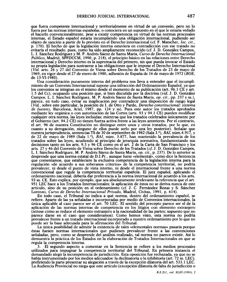 De lo anterior se desprende que una norma estatal de D.I.Pr., aunque fuese «elemental» como dice la Sentencia que comentamos, que estableciere la exclusiva competencia de la legislación interna para la regulación «de acuerdo a sus soberanos criterios» de la competencia territorial, no podría prevalecer, ni desde el punto de vista interno, ni desde el internacional frente a una norma convencional que regule la competencia territorial española. El Juez español, aplicando el Ordenamiento nacional debería dar preferencia a la norma internacional de acuerdo a los artículos 93 y ss. de la C.E. Esto explica por ejemplo que sea absolutamente irrelevante la referencia que el artículo 951 de la L.E.C. hace a los Tratados Internacionales; la aplicación de éstos no se deriva nunca de este artículo sino de su posición en el Ordenamiento, (Cf. J.C. Fernández Rozas y S. Sánchez Lorenzo, Curso de Derecho Internacional Privado, Madrid, Civitas, 1991, p.614)