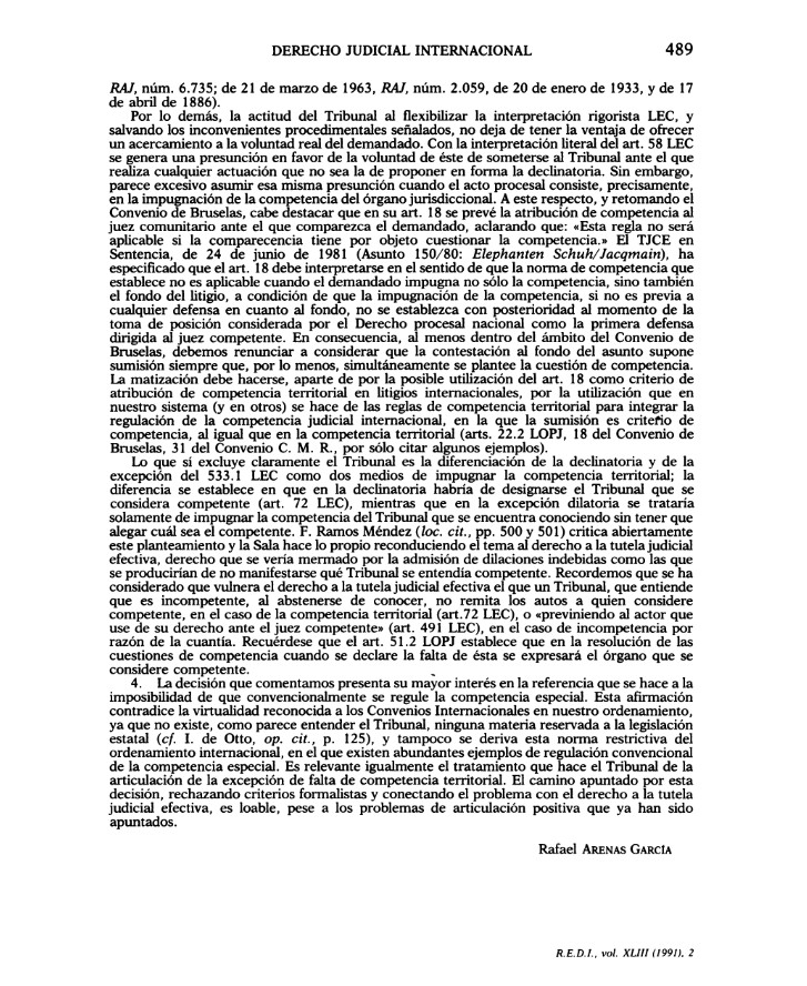 Por lo demás la actitud del Tribunal al flexibilizar la interpretación rigorista de la L.E.C., y salvando los inconvenientes procedimentales señalados, no deja de tener la ventaja de ofrecer un acercamiento a la voluntad real del demandado. Con la interpretación literal del artículo 58 de la L.E.C. se genera una presunción en favor de la voluntad de éste de someterse al Tribunal ante el que realiza cualquier actuación que no sea la de proponer en forma la declinatoria. Sin embargo parece excesivo asumir esa misma presunción cuando el acto procesal consiste, precisamente, en la impugnación de la competencia del órgano jurisdiccional. A este respecto, y retomando el Convenio de Bruselas, cabe destacar que en su artículo 18 se prevé la atribución de competencia al Juez comunitario ante el que comparezca el demandado, aclarando que: «Esta regla no será aplicable si la comparecencia tiene por objeto cuestionar la competencia» El T.J.C.E. en Sentencia de 24 de junio de 1981. (Asunto 150/80: Elephanten Schuh/Jacqmain) ha especificado que el art. 18 debe interpretarse en el sentido de que la norma de competencia que establece no es aplicable cuando el demandado impugna no sólo la competencia sino también el fondo del litigio, a condición de que la impugnación de la competencia, si no es previa a cualquier defensa en cuanto al fondo, no se establezca con posterioridad al momento de la toma de posición considerada por el Derecho procesal nacional como la primera defensa dirigida al juez competente. En consecuencia, al menos dentro del ámbito del Convenio de Bruselas, debemos renunciar a considerar que la contestación al fondo del asunto supone sumisión siempre que, por lo menos, simultáneamente se plantee la cuestión de competencia. La matización debe hacerse, aparte de por la posible utilización del artículo 18 como criterio de atribución de competencia territorial en litigios internacionales, por la utilización que en nuestro sistema (y en otros) se hace de las reglas de competencia territorial para integrar la regulación de la competencia judicial internacional, en la que la sumisión es criterio de competencia, al igual que en la competencia territorial (arts.22.2 de la L.O.P.J., 18 del Convenio de Bruselas, 31 del Convenio C.M.R…. por sólo citar algunos ejemplos).